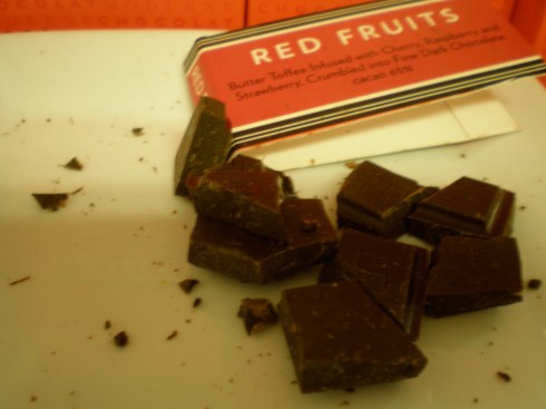 As lovely as the champagne truffles were, I have to say I loved the Moderne ~ Red Fruits bar. This bar is a “blend of fine dark chocolates from Valrhona, is a fresh breeze of red berries and red stone fruits. The crunchy toffee nuggets sprinkled throughout the bar release the unique and fragrant essences of cherries, strawberries and raspberries.” The dark chocolate was intense and the raspberry tart.