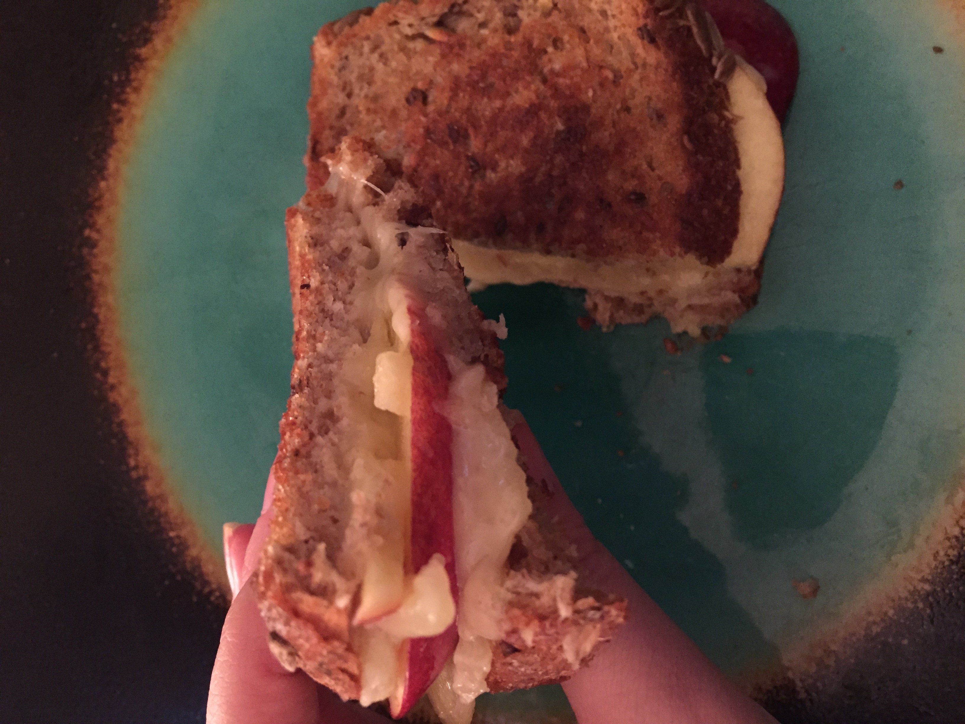 I put a little margarine on the backs of the bread, assembled the cheese, then the apple slices, and then a little more cheese, and then heated them up in the frying pan. It only took a few minutes before each side was golden and warm and gooey.